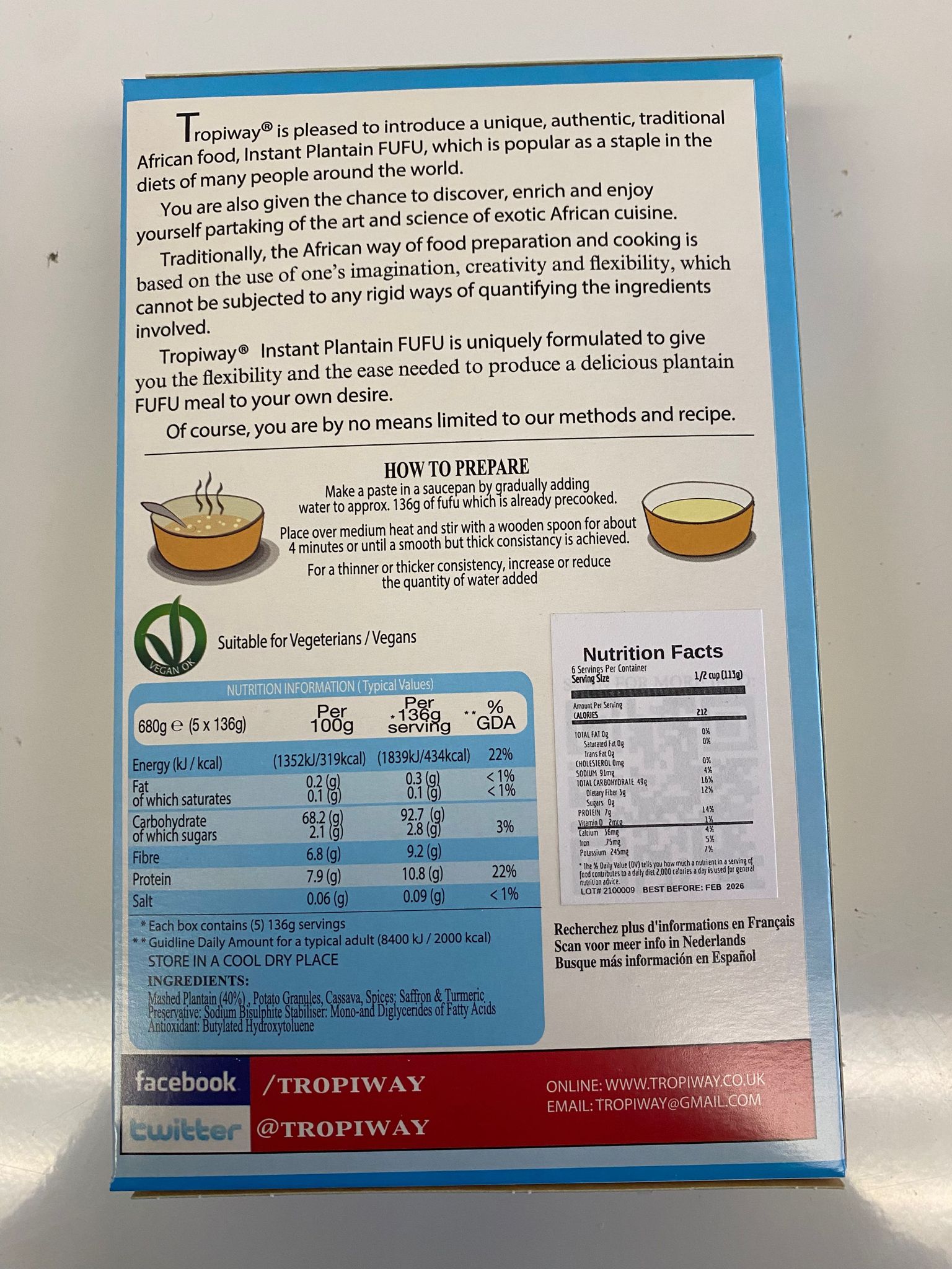 Golden Tropiway Plantain Fufu is made from tropical plantains, with a unique golden hue. Fufu delivers an unparalleled combination of texture, flavor and nutritive value. Enjoy this deliciously filling, nutritious meal for a truly satisfying experience.